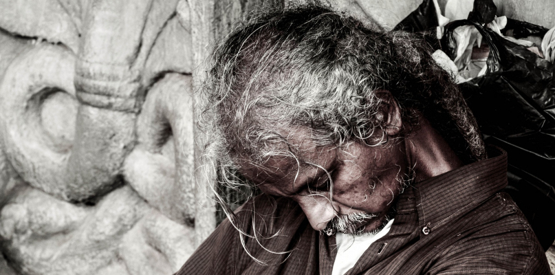 Mężczyzna nie miał butów, skarpetek, a na stopach i rękach miał widoczne rany. Kamera monitoringu dostrzegła go, kiedy wycieńczony usiadł na schodkach przy jednej z kamienic na Starym Rynku.