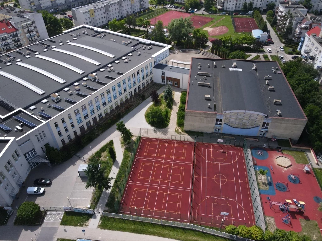 Baza lokalowa szkoły to dwa budynki połączone wewnętrznym przejściem, są udogodnienia dla osób z niepełnosprawnościami – winda, podjazdy i toalety a także trzy duże sale gimnastyczne, boiska sportowe, plac zabaw oraz mini-amfiteatr czyli Plac Słoneczny.