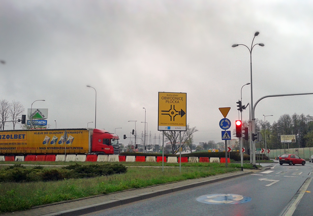 Faktycznie - pierwsze, co rzuca się w oczy na trzech tablicach ustawionych przy rondzie Wojska Polskiego, to informacja o celu, dla którego kierowcy muszą się mierzyć z utrudnieniami: BUDUJEMY OBWODNICĘ PŁOCKA. Niżej jest narysowane skrzyżowanie i zaznaczona nań powstająca czwarta odnoga ronda, a dopiero jeszcze niżej, mniejszymi literami: „Prosimy o ostrożną jazdę”. Pod spodem są jeszcze logotypy - miasta i wykonawcy.