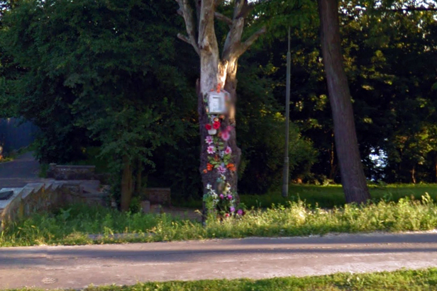 Na zdjęciach: zrzut z Google street view z figurką na drzewie (stan na czerwiec 2013 r.) i aktualny widok tego miejsca