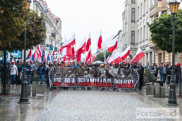 Dziesiątki głównie młodych ludzi, nawet matek z dziećmi, ruszyło w strugach deszczu i skandowało kolejne hasła. Na początek skandowano „Bóg, honor, ojczyzna”, „Każdy Arab niech pamięta, dla nas Polska to rzecz święta”, „Płock przeciw imigrantom”, „My ojczyznę obronimy, kalifatu nie wpuścimy”, „Nie potrzeba nam islamu, terrorystów, muzułmanów”, „Idzie nowe pokolenie, niesie Polsce odrodzenie”, „Polska chrześcijańska nie muzułmańska”, „Płacze Anglia, płacze Francja, tak się kończy tolerancja”, „To jest Polska, nie Bruksela. Do nas szariat nie dociera”, „Chcesz lewaku imigranta, my wolimy repatrianta” czy „Kresowiacy też Polacy”.