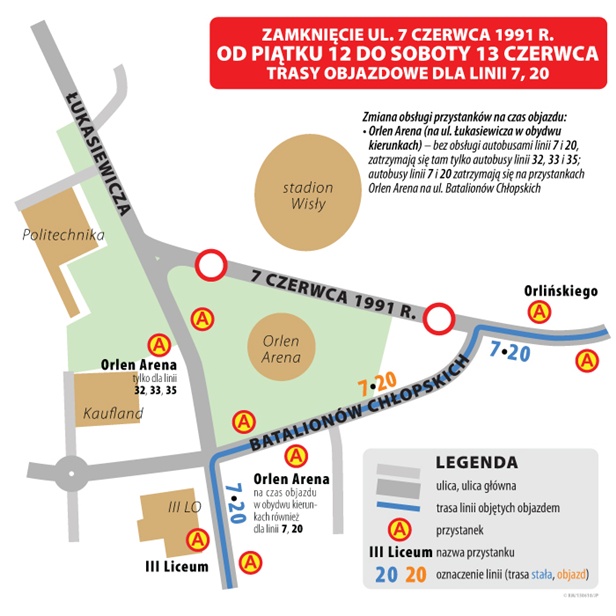 Rzeczniczka Komunikacji Miejskiej Anna Kicińska poinformowała, że w związku z Orlen Olimpiadą w piątek, 12 czerwca od pierwszych kursów porannych aż do ostatnich kursów wieczornych w sobotę autobusy linii „7” i „20” kursujące w obydwu kierunkach pominą przystanek przy Orlen Arenie na ul. Łukasiewicza. Zatrzymają się natomiast na przystanku zlokalizowanym na ul. Batalionów Chłopskich. Ma to związek z zamknięciem dla ruchu ul. 7 czerwca 1991 roku na odcinku od Gwardii Ludowej do Łukasiewicza.