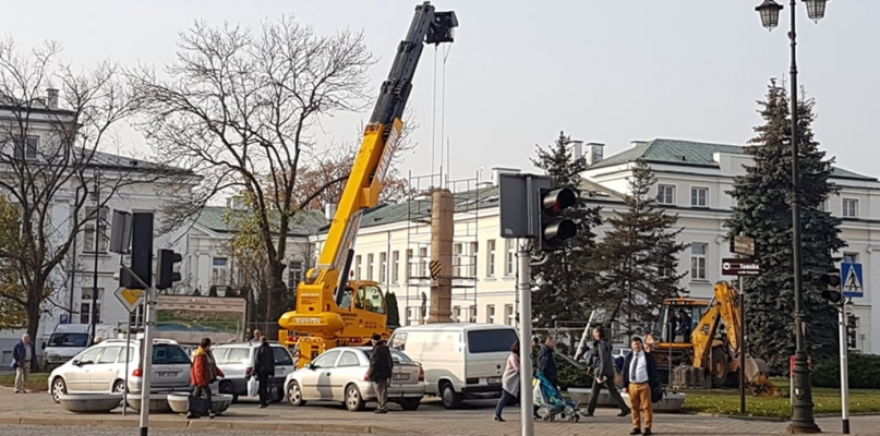 Przypomnijmy, że prace trwają od poniedziałku, ale dopiero dziś rozpoczął się etap ustawiania samej kolumny Obrońców Płocka 1920r. Kolumna składa się z trzech elementów, które zostaną ustawione jeden na drugim, w środku połączone długimi na niemal 60 cm prętami. W piątek mają zostać dowiezione i zamontowane kolejne detale.
