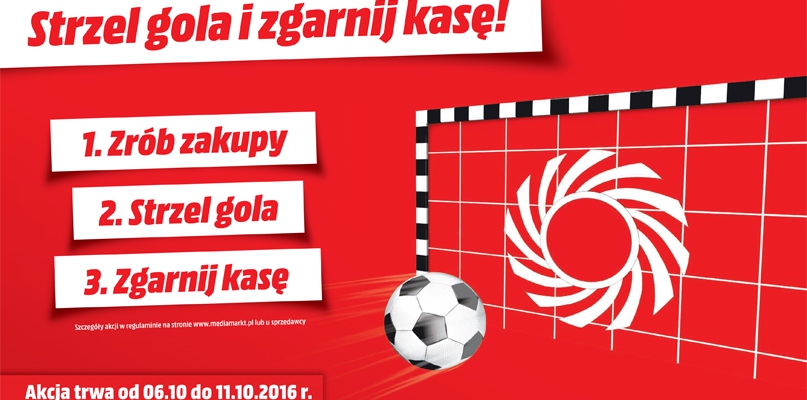 Media Markt rusza z kolejną edycją akcji "Ustrzel darmowe zakupy". Każdy klient, który w dniach 6-11 października, zrobi zakupy w jednym z marketów sieci, będzie mógł poczuć dreszcz emocji, strzelając karnego do bramki Media Markt. Stawka jest wysoka - na zdobywców bramek czeka zwrot pieniędzy wydanych na zakupy!