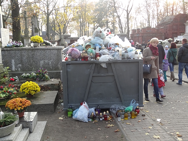 Co roku jest to samo - zaraz za bramą wejściową na cmentarz przy Kobylińskiego odwiedzających groby bliskich na Wszystkich Świętych i Zaduszki wita ogromny kontener z wysypującymi się śmieciami. Kartony, rozbite szkło zniczy i zgniłe kwiaty z wiązanek spadają prosto na czyjąś mogiłę.