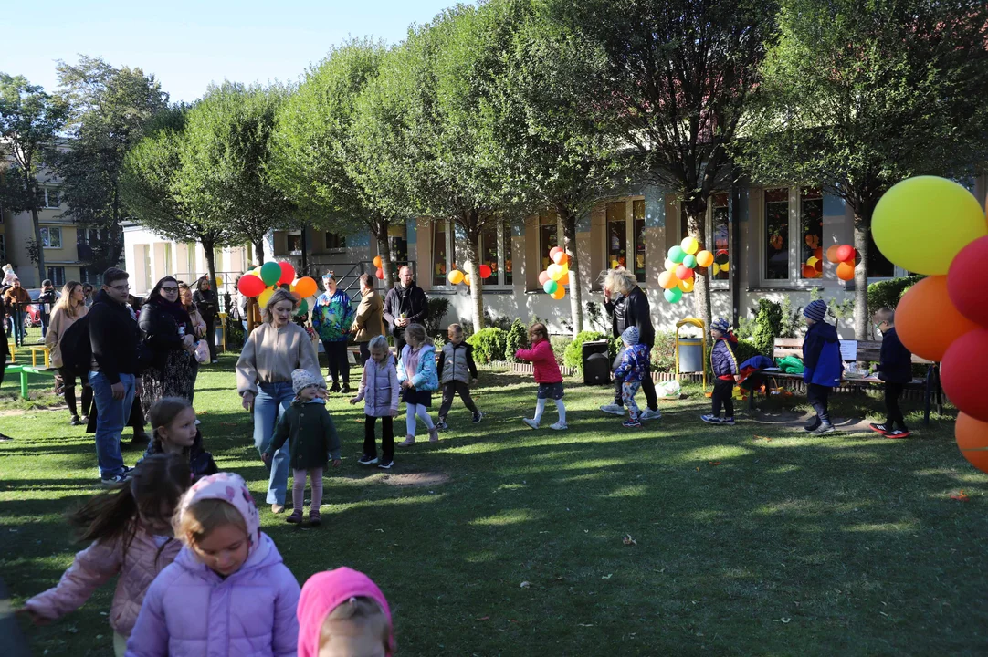 Zabawa zaczęła się o 14:00, a przedszkole solidnie się przygotowało. Plac zabaw i budynek ozdobiły dziesiątki balonów, była strefa poczęstunku, a dzieci zabawiała Pani Jesień.