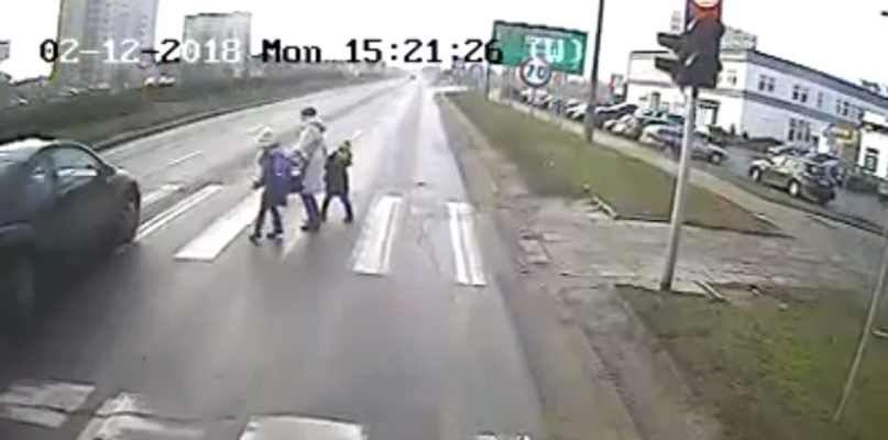 Kamera zamieszczona w jednym z autobusów Komunikacji Miejskiej zarejestrowała auto wjeżdżające na pasy na czerwonym świetle. Na drugą stronę ulicy przechodziła kobieta z dwójką dzieci.