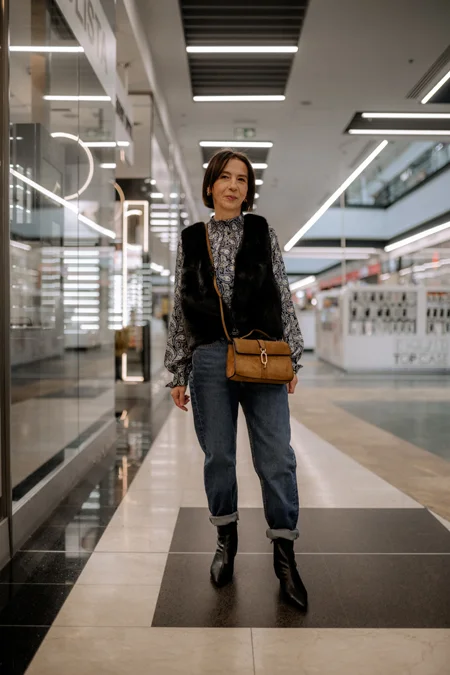 Nowa stylizacja - granatowa, wzorzysta koszula, jeansy typu "balloon", czarne futerko oraz klasyczne czarne półkozaki - okazała się strzałem w dziesiątkę. Cały zestaw pochodzący z H&M podkreślił filigranową figurę pani Ewy, a jednocześnie pokazał, że czasem warto odważyć się na eksperymenty z garderobą.