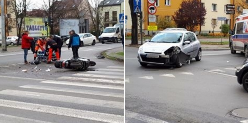 Zderzyło się auto osobowe i skuter. Kierowca jednośladu odniósł obrażenia i trafił do szpitala.