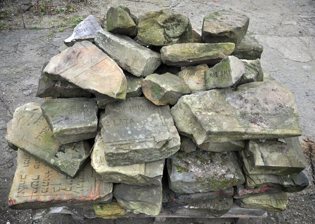 Jednak Andrzej Kierzkowski z Muniserwisu, którego zapytaliśmy o stos przy siatce zakładu, przypomina sobie, że zostały one przywiezione kilkanaście lat temu. - Podczas prac w rejonie skarpy odkryliśmy je przypadkowo na Górkach podominikańskich, gdy prowadziliśmy remont części alejek i schodów - wspomina Andrzej Kierzkowski. - Na początku myśleliśmy, że to zwykłe płyty, z których wykonano z schody, bo ułożone były napisami do ziemi. Dopiero po odwróceniu okazało się, że to nie jest zwykły kamień. Zawiadomiliśmy o odkryciu odpowiednie służby, nakazano nam złożenie znaleziska na terenie firmy.
