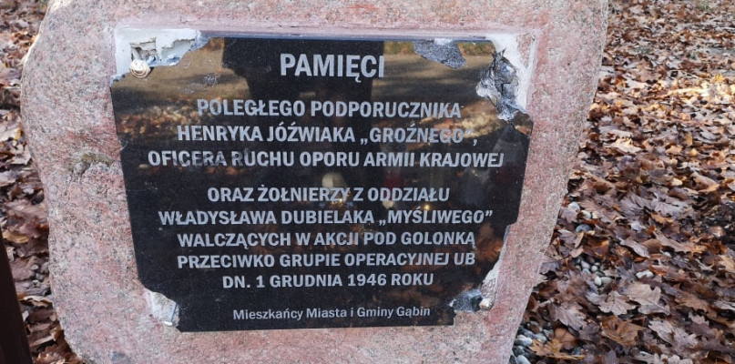 Pamiątkową tablicę odsłonięto niespełna miesiąc temu w Gąbinie. Została poświęcona ppor. Henrykowi Jóźwiakowi, ps. „Groźny” oraz żołnierzom oddziału ROAK. Niestety wandale jej nie uszanowali.
