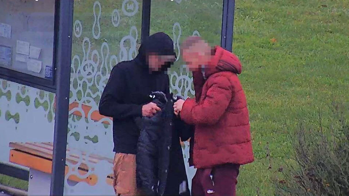 Przebywali na przystanku, trzymając kilka nowych kurtek. Ubrania wciąż miały na sobie klipsy i zabezpieczenia, które mężczyźni uporczywie próbowali zdjąć.