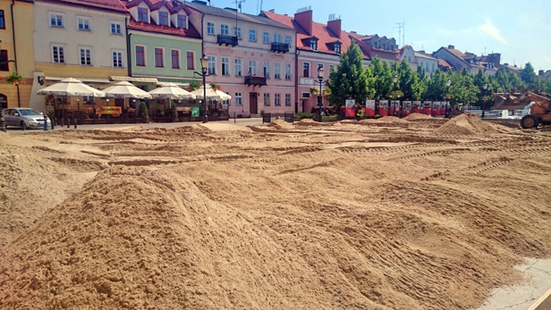 Jak wiadomo, do piłki plażowej potrzebna jest plaża, więc… przed ratuszem właśnie trwa jej usypywanie. Pomysł budził kontrowersje już w ubiegłym roku. Płocczanie zachodzili w głowę, po co wydawać pieniądze na sztuczną plażę, skoro tuż obok jest naturalna wielka, piękna plaża na nabrzeżu, które podobno miasto chce rozruszać? W dodatku z boiskiem do piłki ręcznej plażowej?
